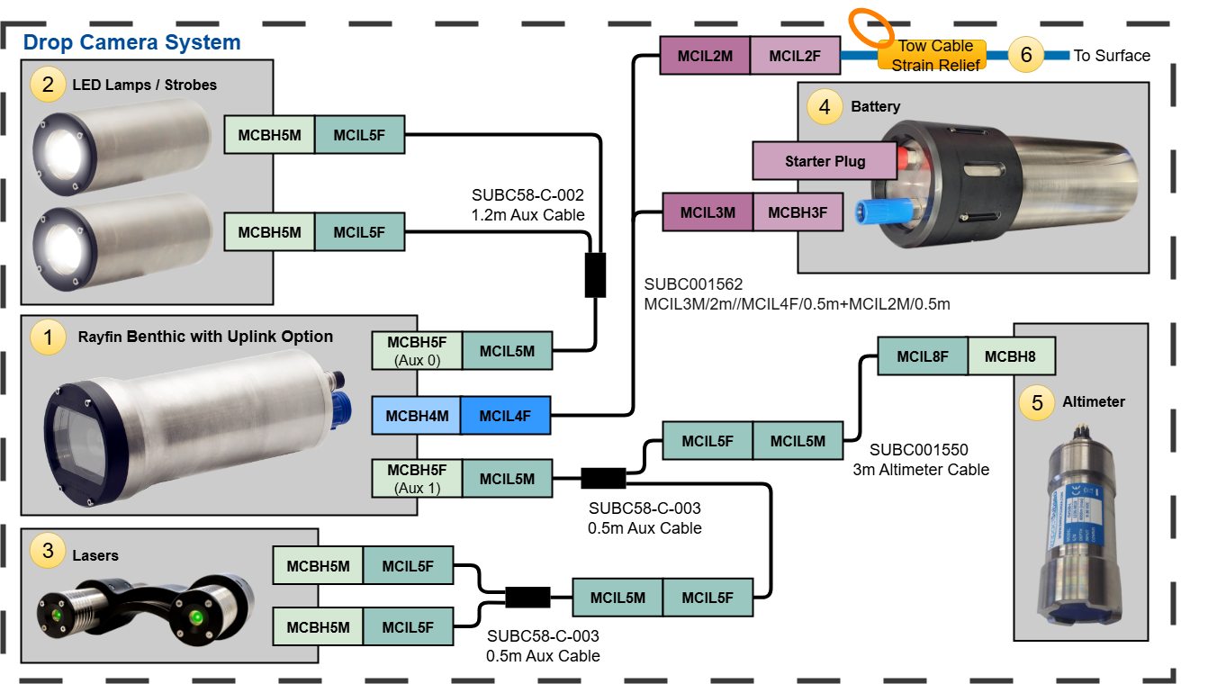 Uplink Example Diagram B: This setup has the camera connected to the surface with a twisted pair cable, but powered from the subsea battery. Autonomous functionality is triggered based on the distance to seafloor from the attached altimeter.