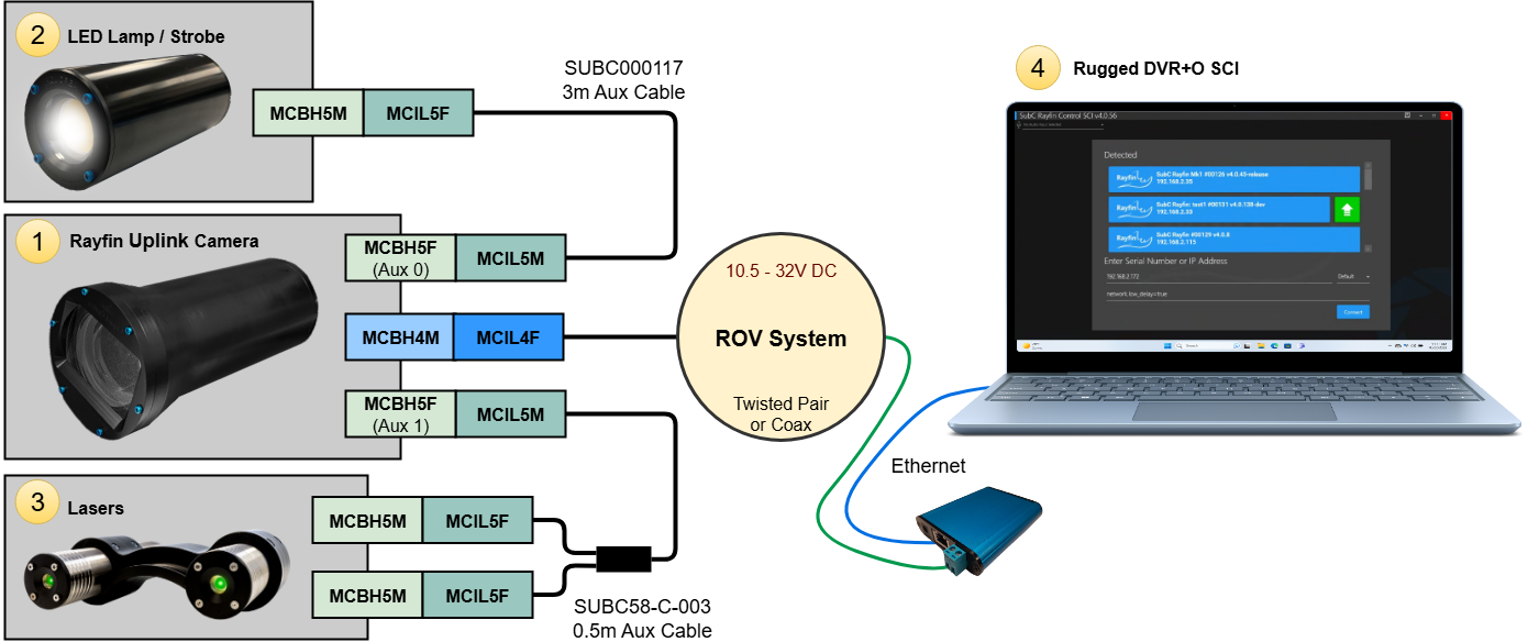 Uplink Example Diagram A: This simple setup allows the sending of HD, 4K, and digital stills data over a twisted pair or coax on a legacy ROV system. There are options for LEDs, Lasers and the Rugged DVR+O to create a full end-to-end inspection system.