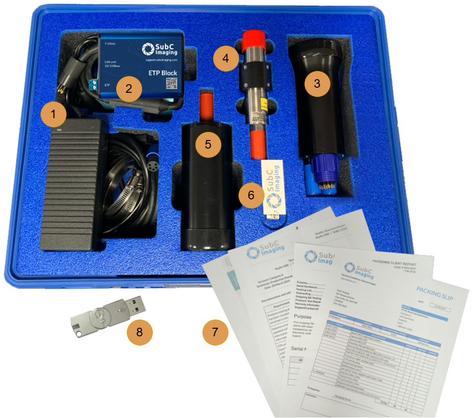 Your shipment will contain the necessary components to power up and test the camera system. This includes the Rayfin Uplink and ETP (Ethernet over Twisted Pair) Block, USB stick with software, AC-DC power supply, Cat5e Ethernet cable, Aux devices such as LEDs or lasers, and necessary cables to connect equipment.