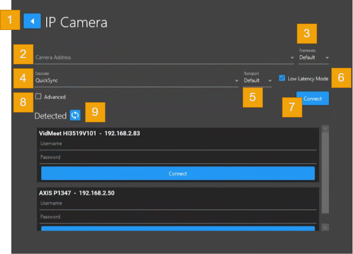 If you have ONVIF cameras on your network, a list of each detected camera will appear in a darkened block like in the image below. Enter the ONVIF Camera authentication username and password here and click the Connect button.