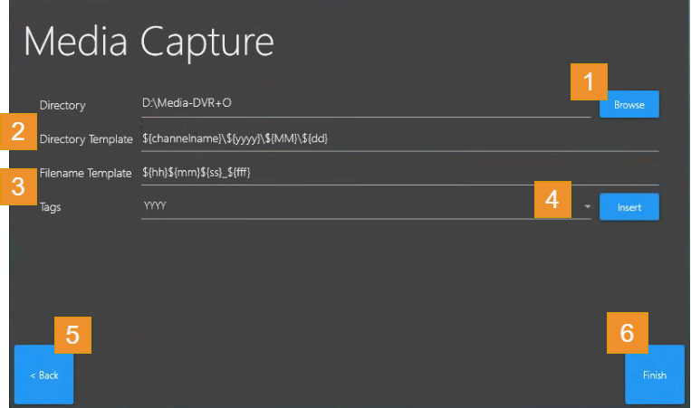 Tags & Insert - Place the cursor in the Directory Template path or the File Template path in a position where you want to add format Tags. Select the desired tag from the Tags dropdown list and click the Insert button to place that tag in the path.