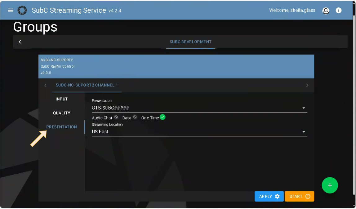 Using the Streaming Service Web application UI, Select your One-Time Stream Presentation for the Channel