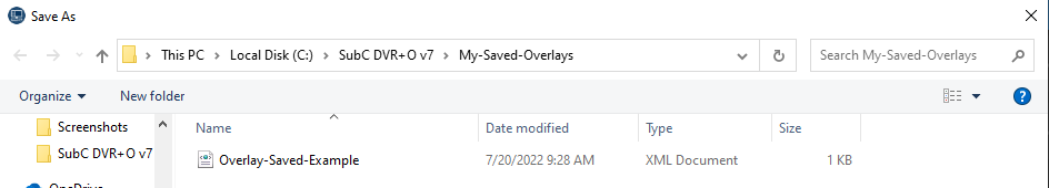 Create a folder where you wish to save your overlays and give the overlay a file name (example: C:\SubC DVR+O v7\My-Saved-Overlays).